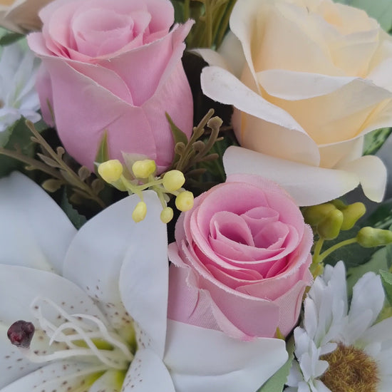Búcaro artificial de una cara con rosas en color crema y rosa clarito y liliums y gerberas mini en blanco. La base de cerámica no está incluida.
