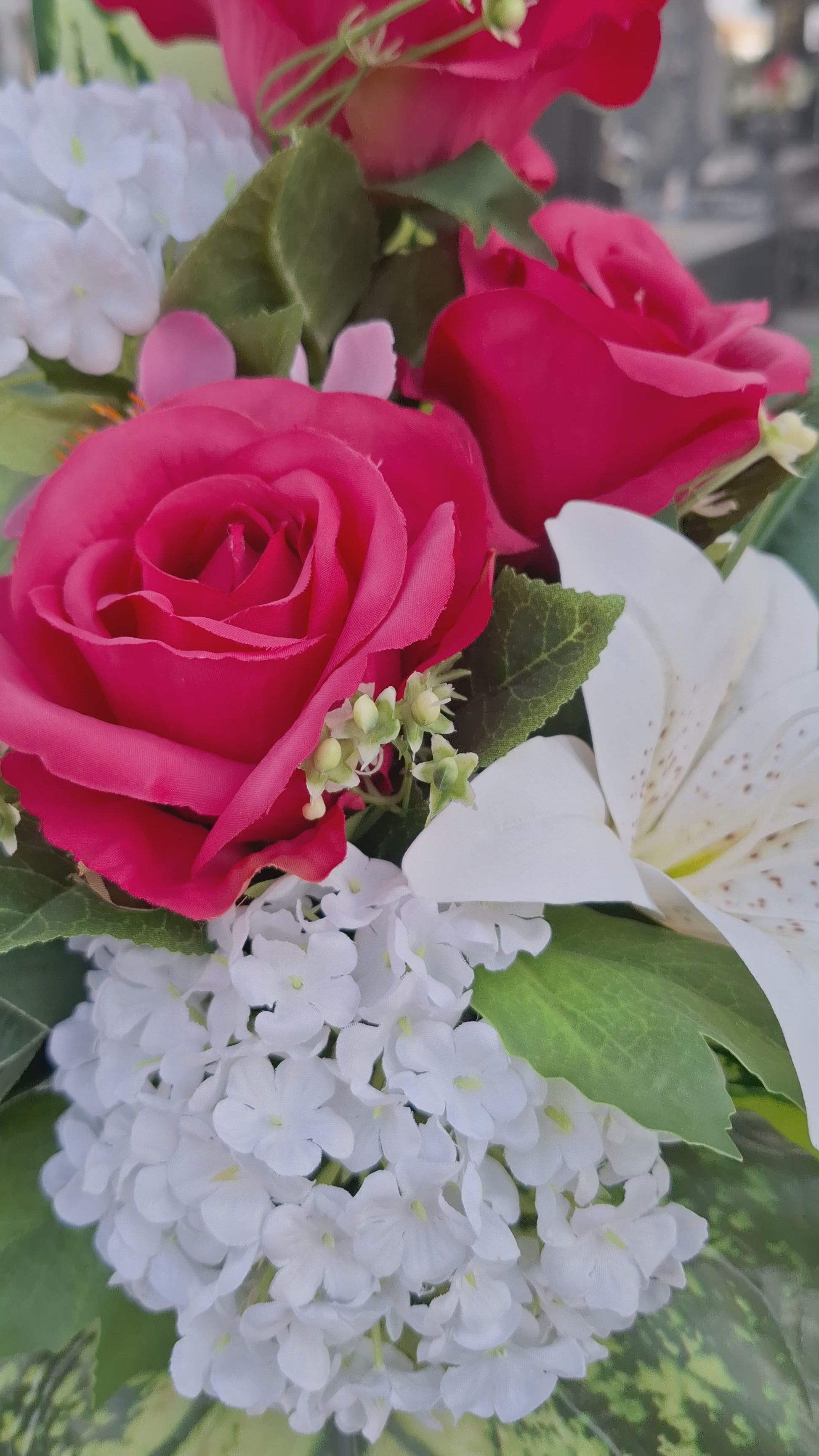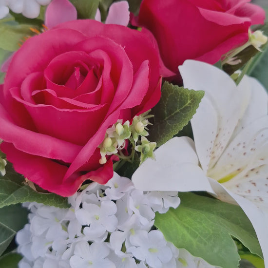 Búcaro artificial de una cara con liliums y viburnum en blanco y rosas de color fucsia. La base de cerámica no está incluida.